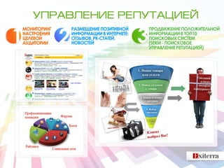 Документ описывает комплексную стратегию мониторинга и продвижения положительных отзывов о компании в интернете, включая анализ сайта, публикацию материалов и работу с негативными отзывами. Зафиксировано значительное увеличение интереса пользователей к отзывам и рост числа онлайн-покупок. Компания Exiterra, работающая более 11 лет, успешно оказывает услуги интернет-маркетинга, достигая высоких результатов в продвижении клиентов.