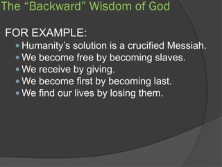 The document discusses the "backward" wisdom of God, where God's ways are not the same as human ways. It provides examples of how humanity finds freedom through slavery, life through death, and strength through weakness. The document argues that true power comes from realizing one's weakness and dependence on Christ, not natural abilities or self-sufficiency. It outlines how through difficulties, commitment to God and serving others, one can experience Christ's power for salvation and service. In the end, it encourages admitting weakness to Christ to access his power.