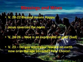 This document summarizes a sermon given by Jesus where he teaches his followers about loving their enemies, not judging others, and being disciples. Some of Jesus' key teachings included loving everyone, even those who don't love you in return; forgiving others as God forgives us; and acting with compassion instead of condemnation. He warned against hypocrisy and emphasized that true disciples live according to his words, building their lives on a firm foundation through obedience.