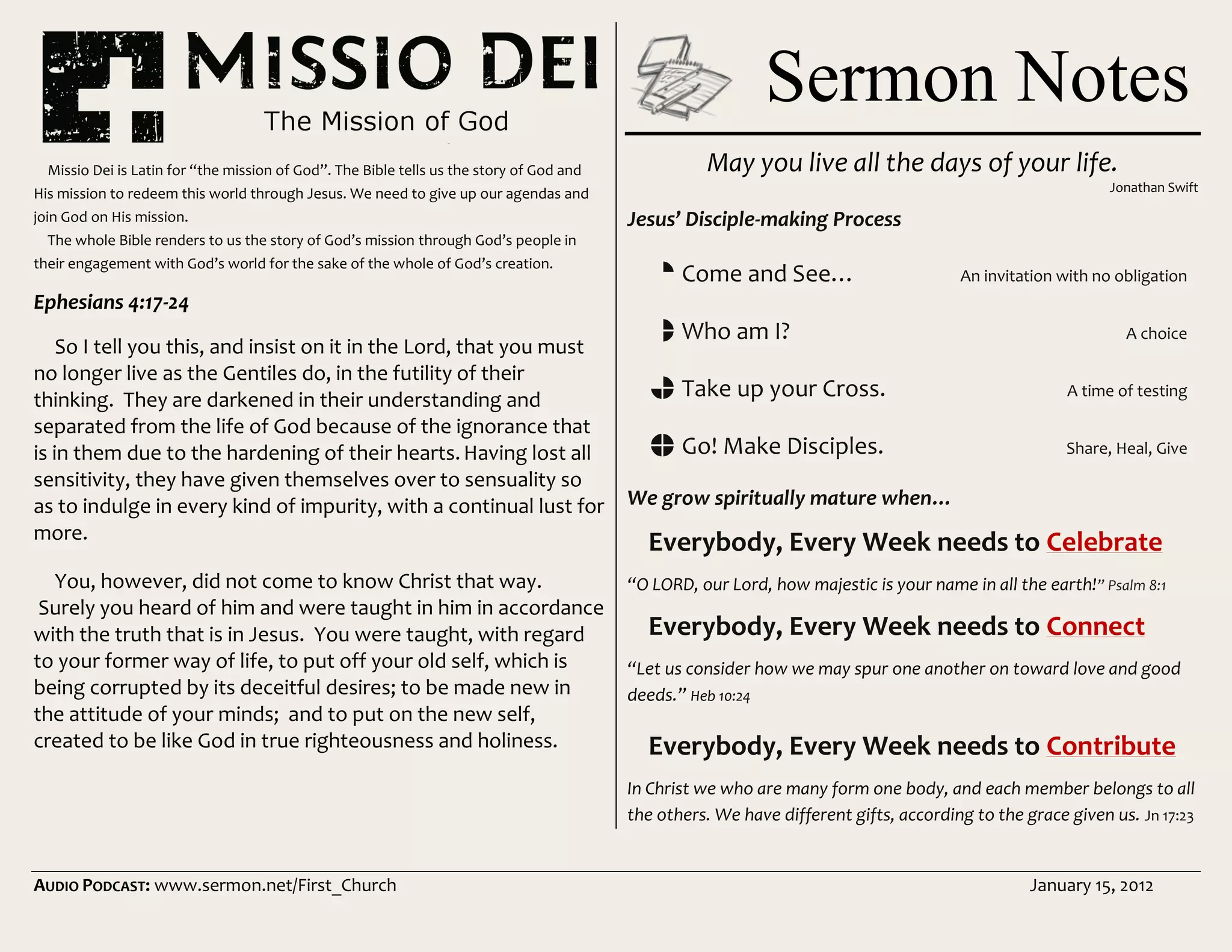 This document is an audio podcast from First Church on January 15, 2012. It discusses the concept of "Missio Dei", which is Latin for "the mission of God". The podcast explains that the Bible tells the story of God's mission to redeem the world through Jesus, and that we must join God on His mission rather than follow our own agendas. It also references a Bible passage from Ephesians about putting off the old self and putting on the new self in Christ. The document provides notes from the sermon on developing spiritually and connecting with others in the church community.