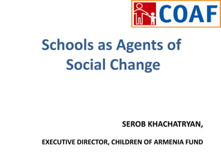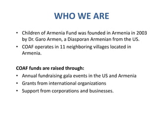 Children of Armenia Fund (COAF) operates in 11 villages in Armenia and was founded in 2003 to create a holistic model for rural development. COAF believes in addressing human and social development through programs in infrastructure, health, education, child and family services, and economic development. COAF considers schools important for transmitting innovative knowledge and empowering children as agents of change, especially in health and education which are growing industries. Challenges include lack of resources and unhealthy lifestyles, but COAF is implementing programs like health clubs, nutrition initiatives, and social-emotional learning to promote health and wellness in schools and communities.