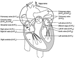 Serotonin is synthesized from tryptophan and is found in high concentrations in the gastrointestinal tract, blood platelets, and central nervous system. It functions as both a neurotransmitter and hormone. Serotonin mediates a variety of effects through multiple receptor subtypes, including smooth muscle contraction, vasoconstriction, platelet aggregation, gastrointestinal motility, mood, appetite, and sleep. Dysregulation of serotonin signaling has been implicated in conditions like migraine, depression, anxiety, and carcinoid syndrome, a tumor that secretes excess serotonin. A number of drugs target specific serotonin receptors to treat associated symptoms.