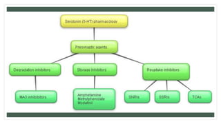 Serotonin is a neurotransmitter that plays an important role in many physiological and psychological functions. It is synthesized from tryptophan and transported into presynaptic neurons by VMAT2. After release, it is terminated by reuptake via SERT or degradation by MAO and ALDH. Serotonin receptors are located throughout the brain and body. Serotonin is implicated in various psychiatric conditions like depression, anxiety, OCD, schizophrenia, and personality disorders. Drugs that affect serotonin levels, like SSRIs, SNRIs, TCAs, and MAOIs, are used to treat many of these disorders.