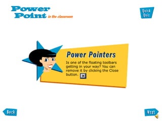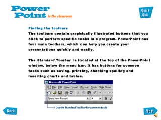 The document introduces PowerPoint basics including its main toolbars, how to move and dock toolbars, and how to access and use the Office Assistant for help. It discusses the Standard, Formatting, and Drawing toolbars and their functions. It also covers adding and removing toolbars, common PowerPoint terms, and introducing these concepts to students in a systematic way toolbar-by-toolbar.