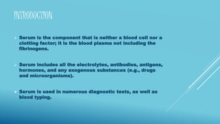 Serum protein electrophoresis is used to separate serum proteins into fractions based on their size and electrical charge. It has five major fractions: albumin, alpha1, alpha2, beta, and gamma globulins. Specific diseases and conditions cause abnormal patterns in the fractions. For example, liver disease decreases albumin levels while nephrotic syndrome increases alpha2 levels due to protein loss in the urine. The test is useful for identifying inflammatory states, immunodeficiencies, and monoclonal gammopathies.