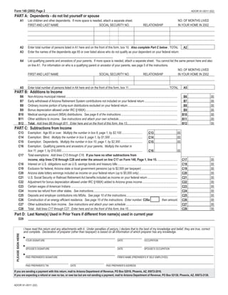 This document is an Arizona state personal income tax return form for the year 2002. It requests standard personal information like the taxpayer's name, address, social security number, filing status, and number of exemptions. It then guides the taxpayer through reporting their federal adjusted gross income, any additions or subtractions to income, deductions, exemptions, tax credits, payments and refund or taxes owed. The form is multi-page with sections to list dependents, additions to income, subtractions from income, and last names used in prior years if different from the current filing year.