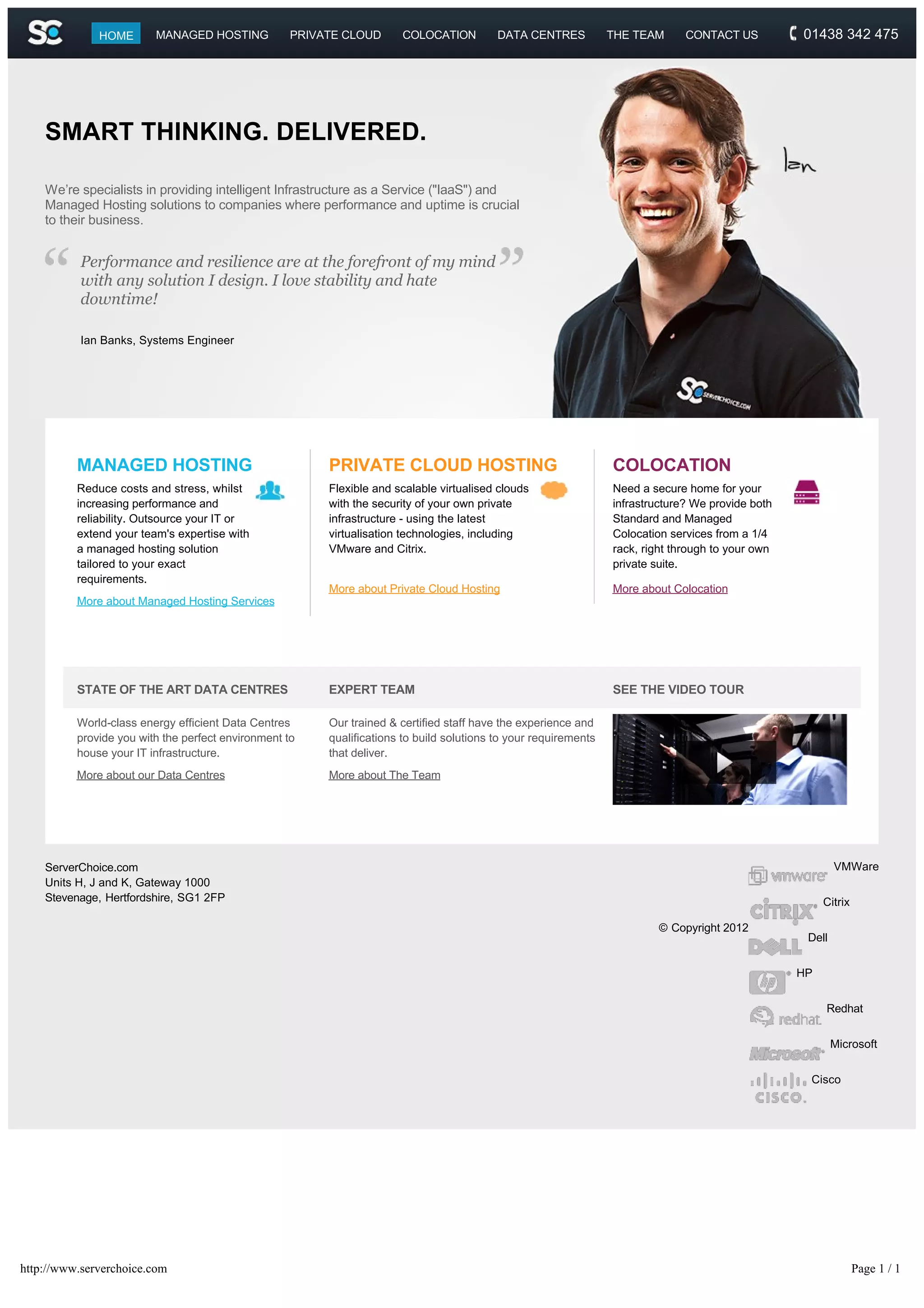 ServerChoice provides intelligent infrastructure as a service (IaaS) and managed hosting solutions focused on performance and uptime. Their solutions include managed hosting, private cloud hosting, and colocation services delivered from state-of-the-art data centers and supported by an expert team dedicated to stability and minimizing downtime.
