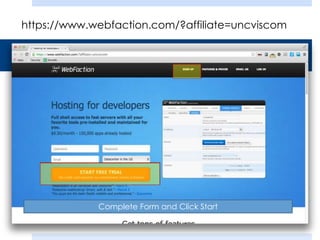 This document provides instructions for setting up a server and domain with WebFaction, including registering a domain with GoDaddy and connecting the domain to the WebFaction server. The key steps are: