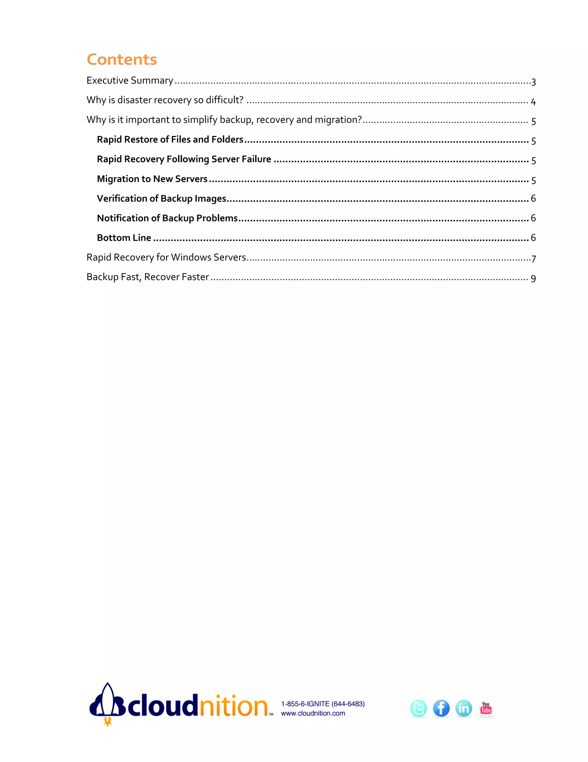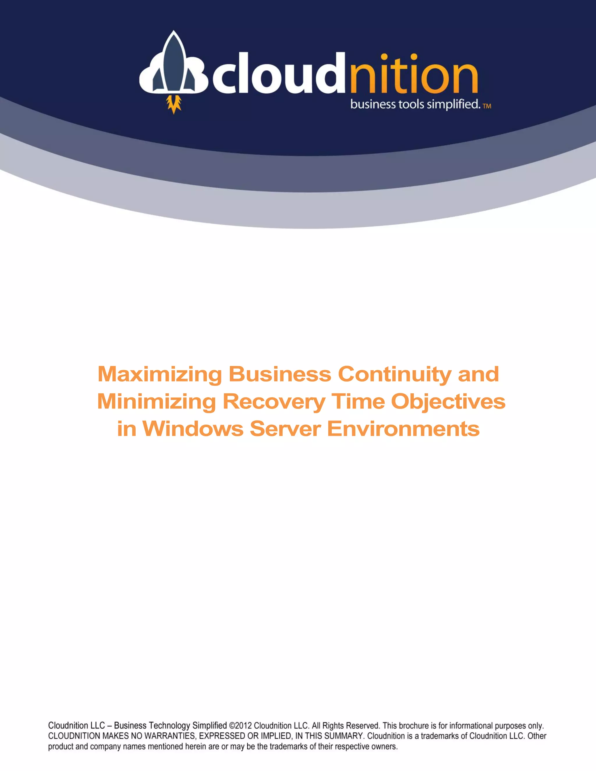 This document discusses how to simplify backup, recovery, and migration processes for Windows server environments. It outlines challenges like long recovery times when servers fail and complex migration procedures. The solution discussed is Cloudnition ServerSave Server, which allows for fast, image-based backups that minimize recovery time objectives. ServerSave Server provides rapid recovery by restoring a point-in-time backup image that contains the full server environment. It also enables quick migration to new or virtual servers through features like Hardware Independent Restore.