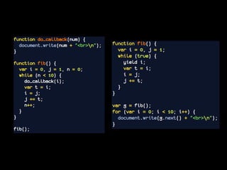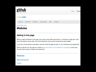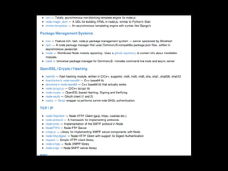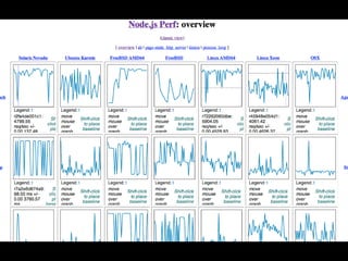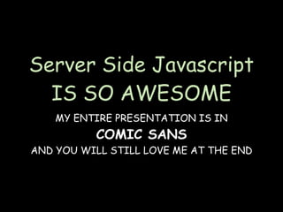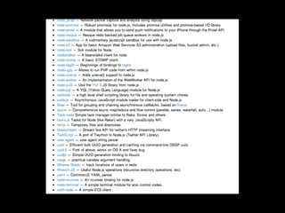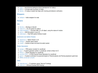 This document discusses using JavaScript on the server side with Node.js and the YUI framework. It begins by explaining why server-side JavaScript is useful and discusses JavaScript runtimes like V8, SpiderMonkey, and Rhino. It then covers Node.js, CommonJS frameworks, and how to use YUI modules on the server by enabling YUI's module loader. Examples are provided for accessing remote data, rendering HTML on the server, and implementing progressive enhancement.