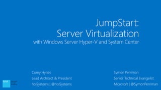 This document provides an overview of a two-day training course on server virtualization with Windows Server Hyper-V and System Center. Day 1 covers installing and configuring Hyper-V, creating and managing virtual machines and networks. Day 2 focuses on installing and using System Center Virtual Machine Manager to manage the virtualization infrastructure, including networking, storage, and virtual machines. The presenters are introduced, including their backgrounds working with Microsoft virtualization technologies.