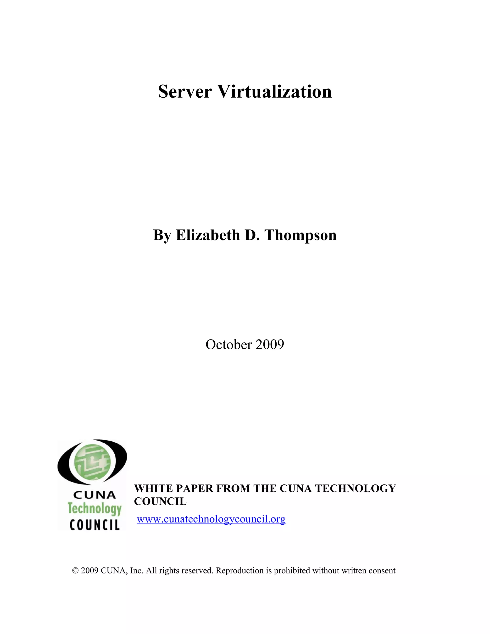 Virtualization allows a physical server to be partitioned into multiple virtual machines, each capable of running its own operating system. This allows many servers to be consolidated onto a single physical machine, reducing costs associated with server sprawl, energy usage, cooling needs, and downtime. It provides major benefits like the ability to quickly create, switch, and eliminate virtual machines, improving software testing, backup/disaster recovery, and productivity. While virtualization is gaining acceptance in credit unions, only 7% currently use it, though many more plan to implement it in the next three years as costs decrease.