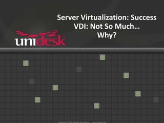 The webinar discusses the challenges and complexities associated with Virtual Desktop Infrastructure (VDI) compared to successful server virtualization, highlighting issues like user acceptance, migration difficulties, and unclear ROI. It emphasizes the importance of a well-defined desktop virtualization strategy and the trade-offs involved, particularly regarding single image management versus personalization and storage costs. The session also covers practical VDI implementation experiences, including technology recommendations and common pitfalls to avoid.