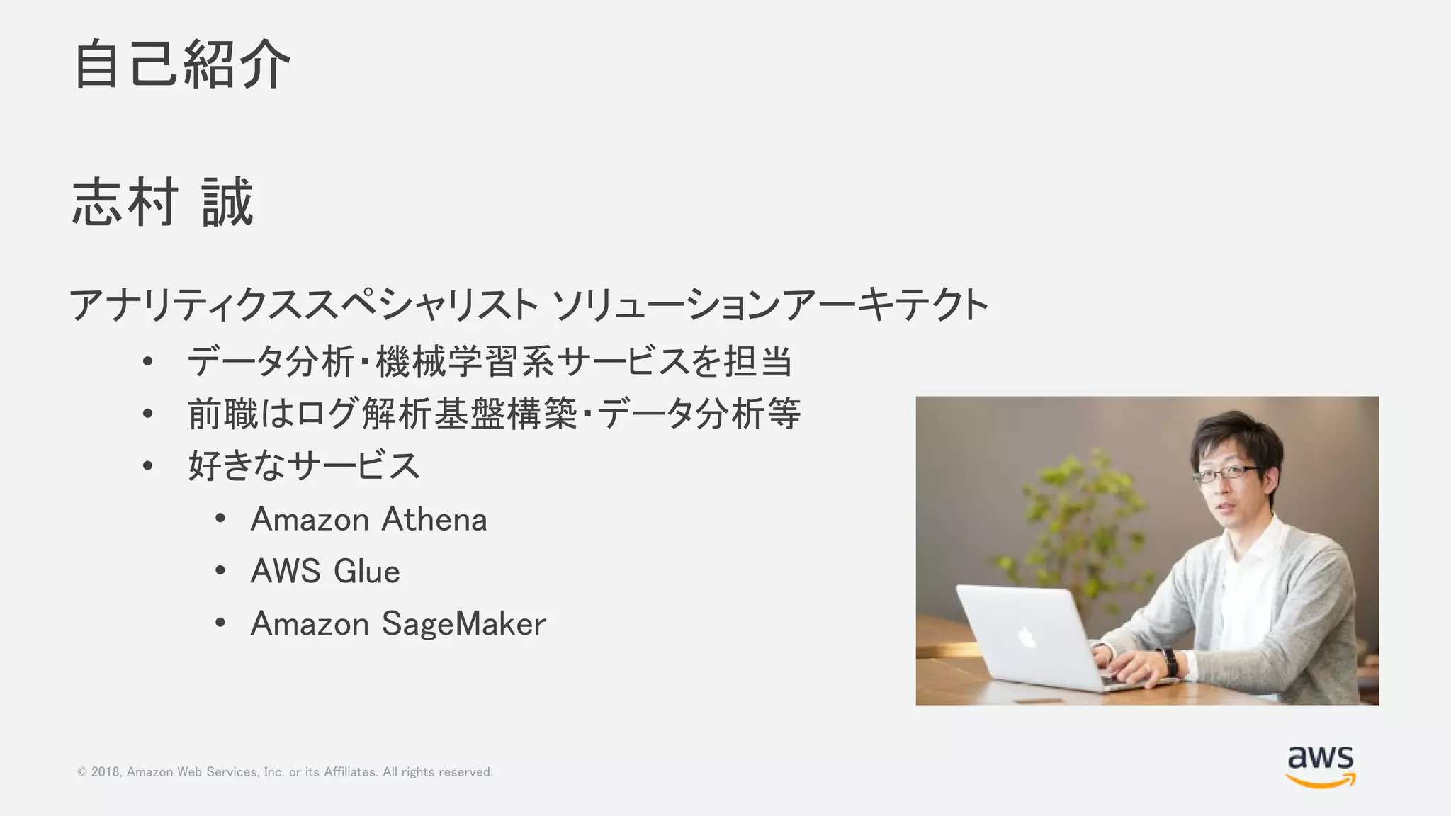 © 2018, AmazonWeb Services, Inc. or its Affiliates. All rights reserved. 自己紹介 志村 誠 アナリティクススペシャリスト ソリューションアーキテクト • データ分析・機械学習系サービスを担当 • 前職はログ解析基盤構築・データ分析等 • 好きなサービス • Amazon Athena • AWS Glue • Amazon SageMaker