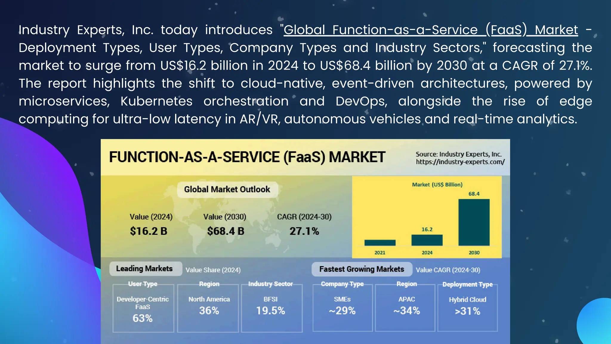 Industry Experts, Inc. today introduces "Global Function-as-a-Service (FaaS) Market - Deployment Types, User Types, Company Types and Industry Sectors," forecasting the market to surge from US$16.2 billion in 2024 to US$68.4 billion by 2030 at a CAGR of 27.1%. The report highlights the shift to cloud-native, event-driven architectures, powered by microservices, Kubernetes orchestration and DevOps, alongside the rise of edge computing for ultra-low latency in AR/VR, autonomous vehicles and real-time analytics.