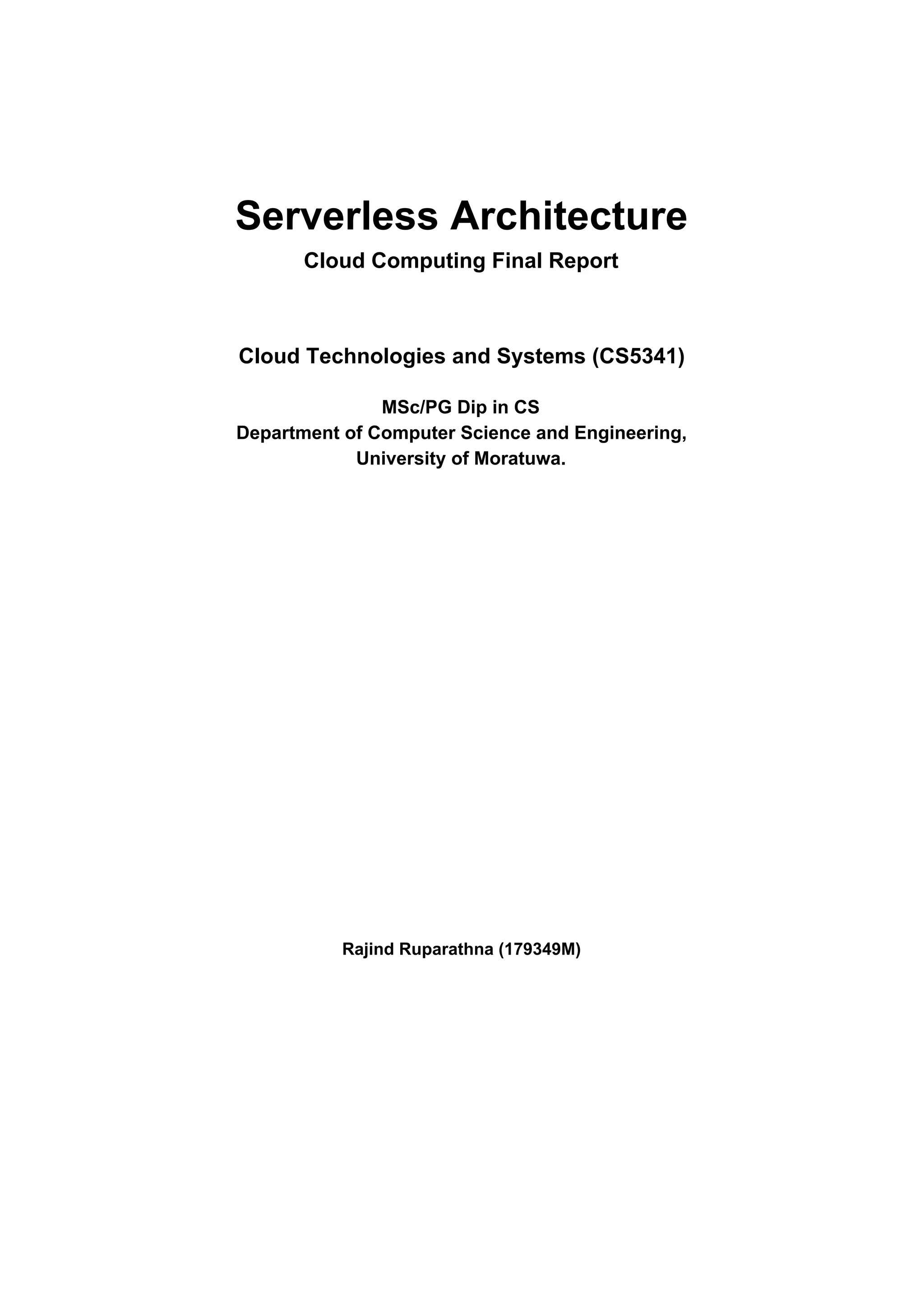 The document is a final report on serverless architecture and its implications within cloud computing, particularly emphasizing its benefits, drawbacks, and implementation models. It discusses the underlying technologies like containers and orchestration platforms that enable Function as a Service (FaaS), with AWS Lambda being a prominent example. The report also highlights the operational cost savings and automatic scaling advantages of serverless architecture but notes concerns such as vendor control and state management issues.