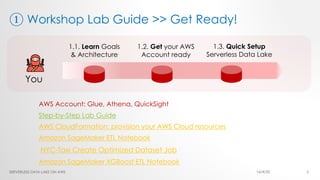 The document is a workshop lab guide for building a serverless data lake on AWS, specifically focused on processing and analyzing NYC taxi trip data using AWS services such as Glue, Athena, and SageMaker. It describes the steps to set up a data lake, optimize datasets for reporting, and develop machine learning models to predict passenger tipping behavior. The guide includes practical hands-on exercises for cataloging data, querying datasets, and applying ETL (extract, transform, load) workflows.