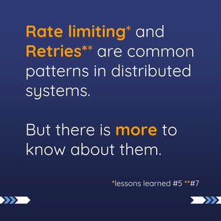 The document discusses lessons learned about using exponential backoff and rate limiting in serverless applications on AWS. It emphasizes the importance of increasing backoff delays to avoid exceeding service rate limits and managing parallel requests effectively by implementing jitter to prevent collisions. Additionally, the AWS SDK provides built-in support for retries and backoff strategies that can be customized as needed.