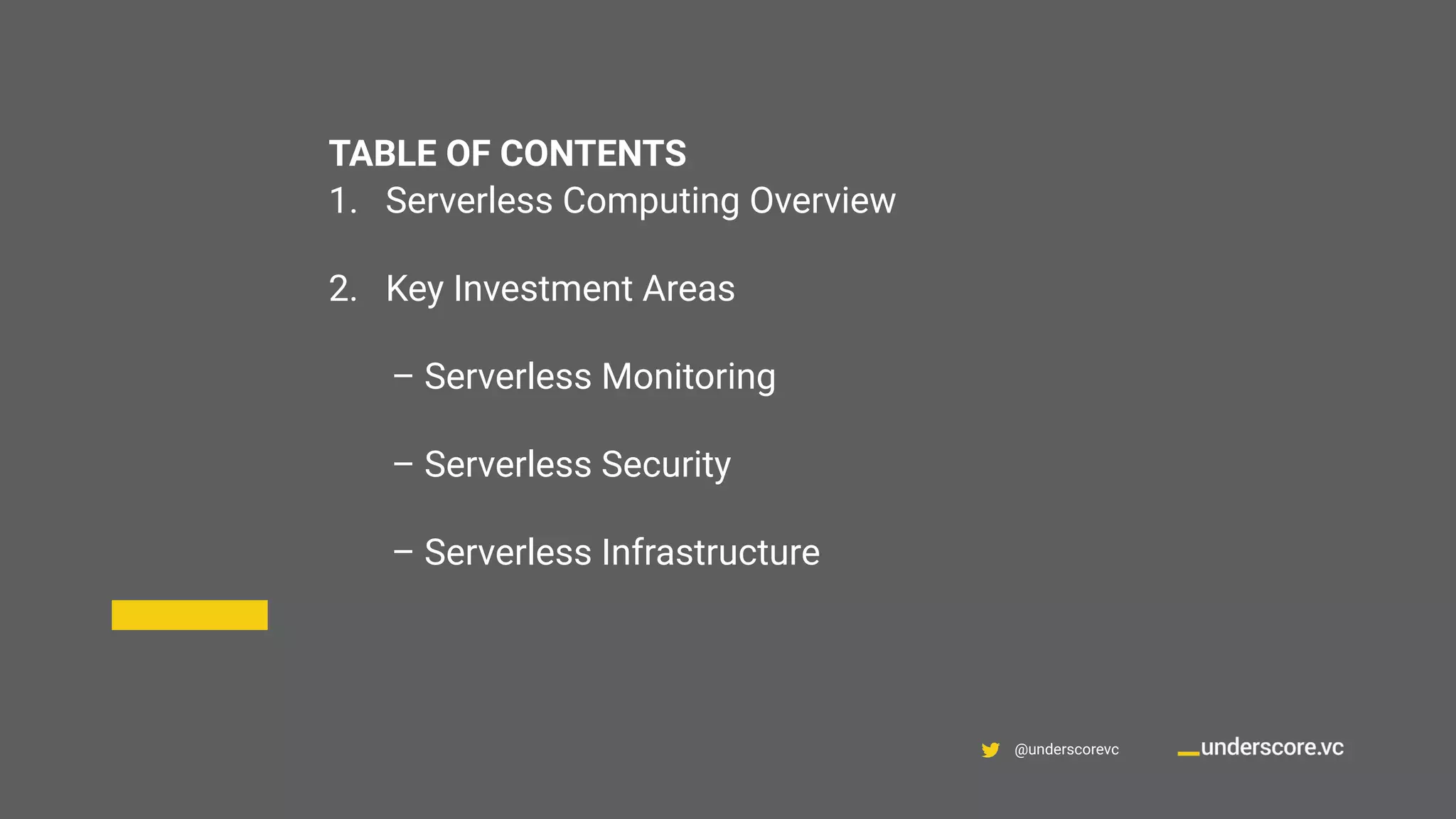 The document discusses serverless computing and key investment opportunities in the space. Serverless computing refers to cloud-based event-driven computing where the cloud provider manages the infrastructure. The document outlines the benefits of serverless computing including ease of scaling, reduced costs, and increased productivity. It also discusses some challenges around vendor lock-in, lack of control, and multitenancy. The document identifies serverless monitoring, security, and infrastructure as key investment areas. It provides overviews of serverless monitoring companies IOPipe and Dashbird which provide tools to monitor and debug serverless applications.