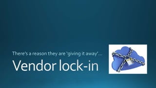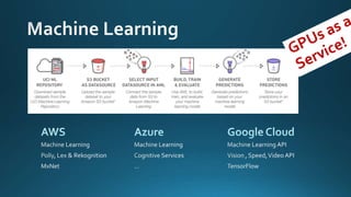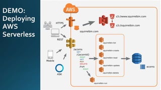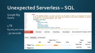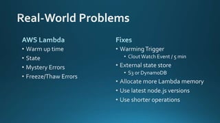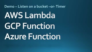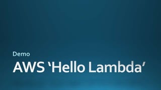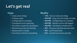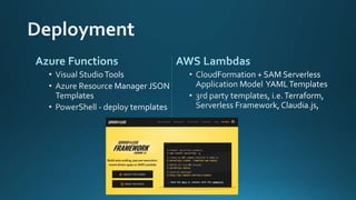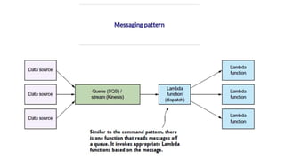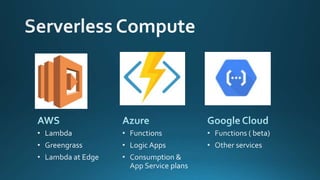 This document discusses serverless computing and compares it to traditional server-based computing. It defines serverless computing and provides examples of serverless technologies like AWS Lambda. It also outlines common use cases for serverless computing like handling dynamic workloads and scheduled tasks. Finally, it compares different services between server-based and serverless models like compute, files, databases, data pipelines, machine learning, and IoT.