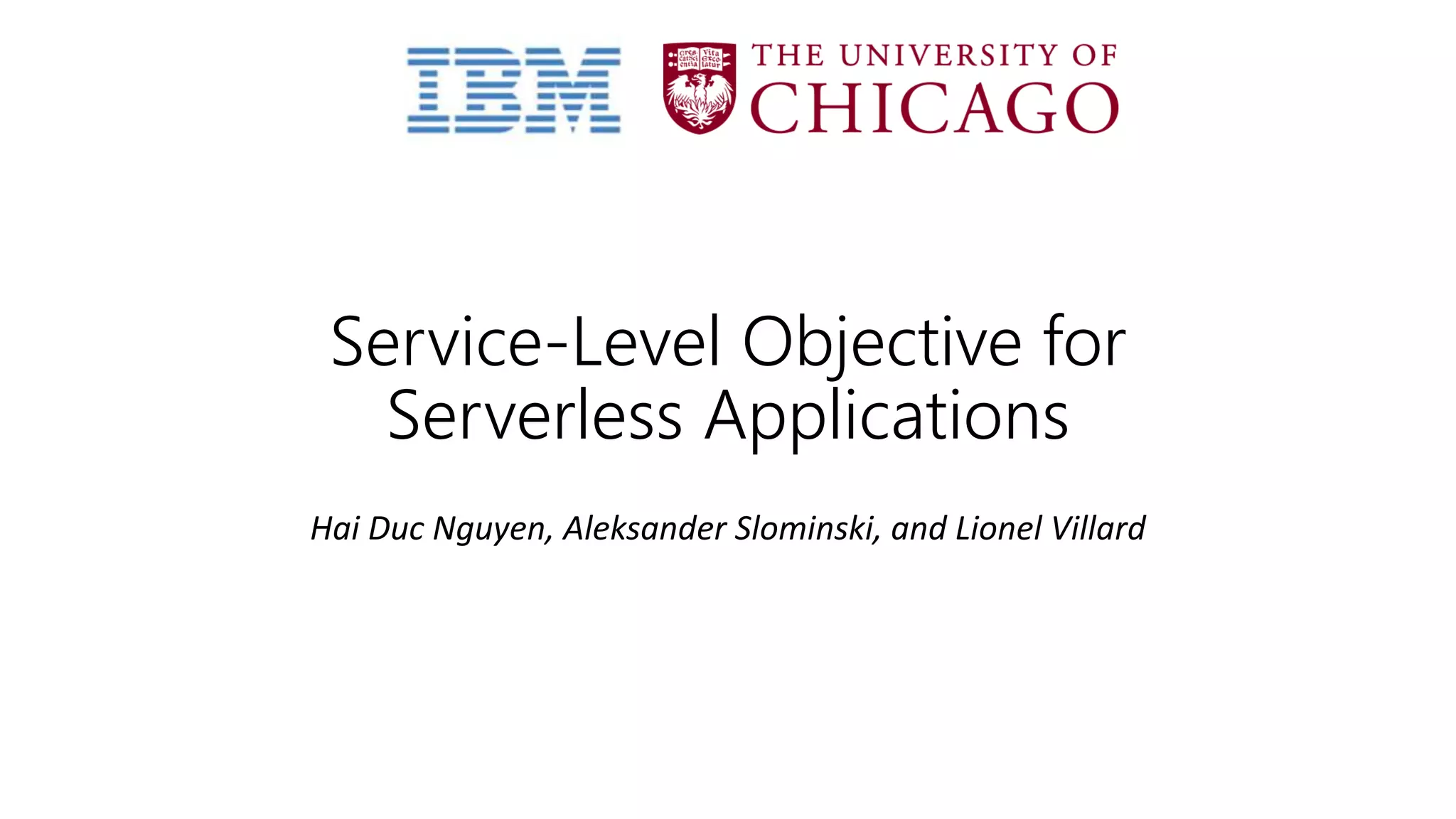 The document discusses service-level objectives (SLOs) and software-level agreements (SLAs) for serverless applications, emphasizing the importance of performance metrics in translating business goals into actionable implementations. It highlights the benefits of using serverless architectures, particularly with Kubernetes and Knative, to optimize resource management and enforce SLOs effectively. Future goals include improving SLO enforcement mechanisms and extending these concepts to broader serverless platforms.