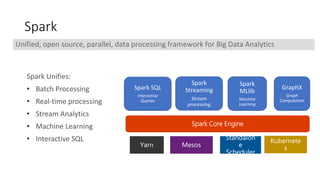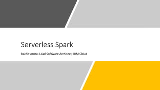 The document discusses the serverless Spark framework and its integration with Kubernetes for big data analytics, outlining various deployment options, including multitenant Spark clusters and function as a service. It emphasizes the advantages of Kubernetes, such as high availability, flexibility, and reduced operational costs. Additionally, the document highlights the role of data scientists in utilizing Spark for various analytics tasks and provides references for further resources.