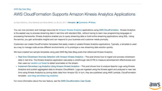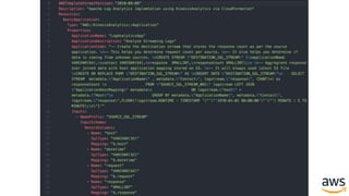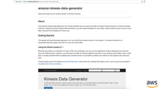 This document provides an overview of building a real-time streaming data visualization system with Amazon Kinesis Analytics. It begins with an introduction and outlines what will be covered, including streaming data, the Amazon Kinesis platform, Kinesis Analytics patterns and features, and a walkthrough of an end-to-end streaming data example. It then provides details on the Amazon Kinesis platform and services, demonstrates how to write SQL queries to analyze streaming data in Kinesis Analytics, and shows how to output results to destinations like Kinesis streams, S3, and DynamoDB. It concludes with notes on deploying Kinesis Analytics applications and testing.