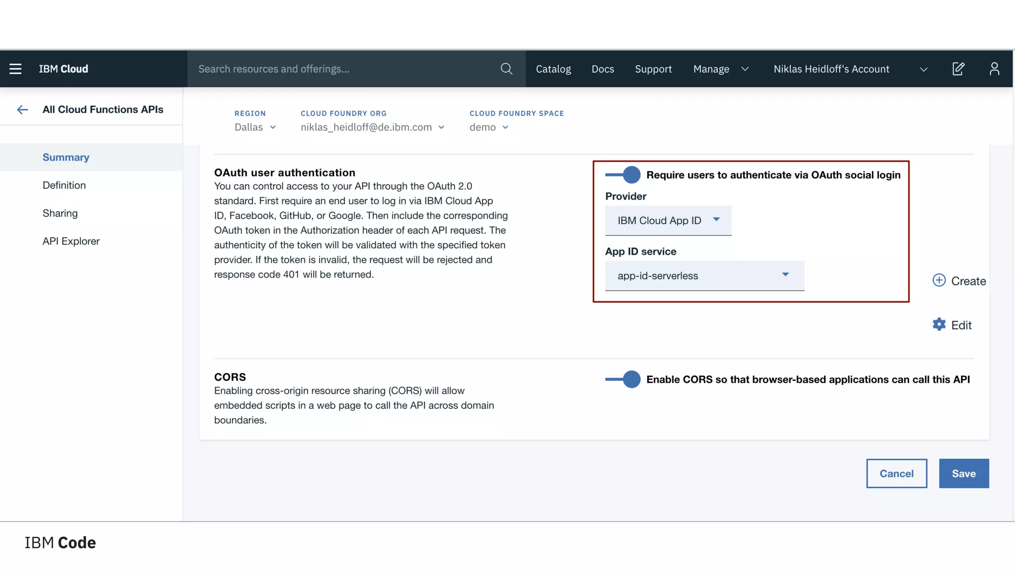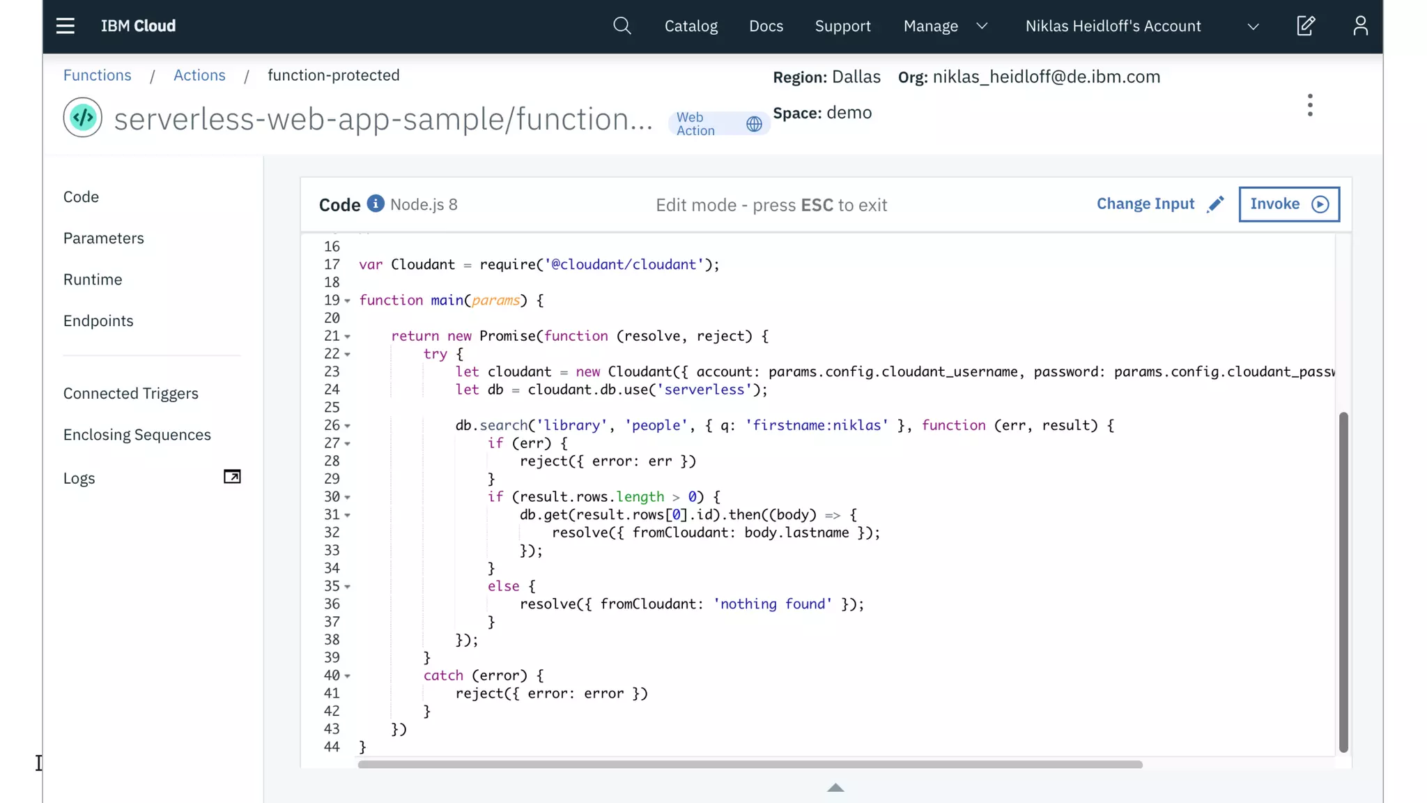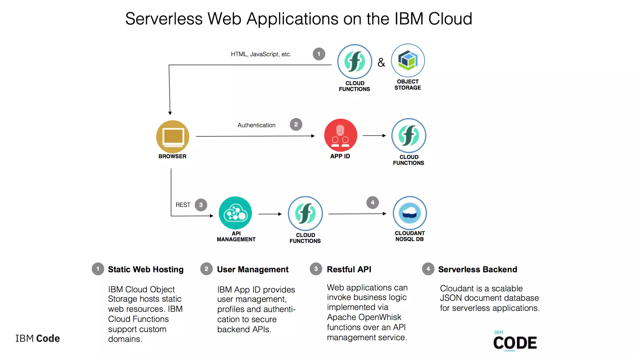 The document discusses building serverless web applications on IBM Cloud using Apache OpenWhisk. It explains that serverless technologies can save costs for web applications that are not used 24/7 by avoiding maintaining infrastructure and servers. The document provides an example of an end-to-end serverless web application architecture using IBM components like App ID for authentication, Cloudant for the database, and Cloud Object Storage for static resources. It also shares a GitHub link to the sample code.