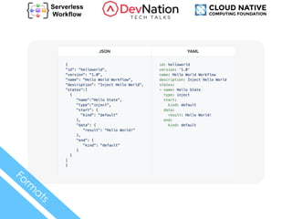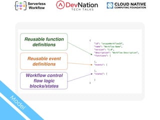 The document details the definition of a declarative workflow model for orchestrating event-driven, serverless applications under the CNCF Serverless Working Group. It outlines the creation of a vendor-neutral, platform-independent model that facilitates portability and includes features such as stateful and stateless orchestration, event consumption, and error handling. Additional resources and integration methods are provided, along with links to relevant tools and communities.