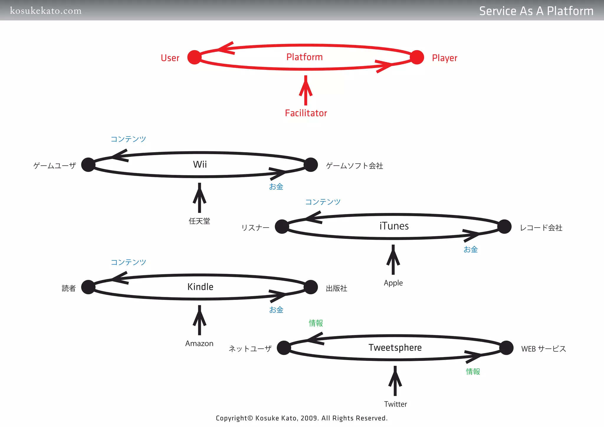 2009. All Rights Reserved. Service As A Platform Platform PlayerUser Facilitator Wii ゲームソフト会社ゲームユーザ 任天堂 iTunes レコード会社リスナー Apple Kindle 出版社読者 Amazon Tweetsphere WEB サービスネットユーザ Twitter お金 コンテンツ 情報 情報 お金 コンテンツ お金 コンテンツ