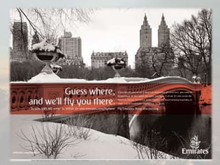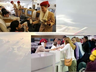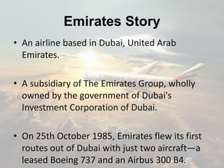 Emirates is an airline based in Dubai that was established in 1985 with backing from Dubai's royal family. It has grown to become the largest airline in the Middle East operating nearly 3,400 flights per week to over 142 cities globally. Emirates is known for its high quality services across all cabin classes and seeks to be the first to offer new technologies to customers such as WiFi and personal entertainment screens on all flights. It uses a premium pricing strategy to target customers willing to pay more for luxury services.