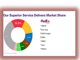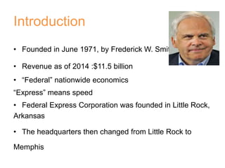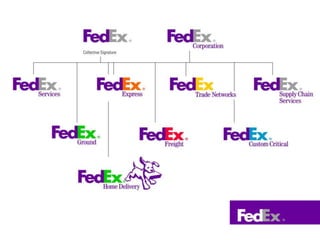 FedEx was founded in 1971 and has grown to be a global leader in delivery services, with $11.5 billion in revenue as of 2014. It operates through four business segments: FedEx Express, FedEx Ground, FedEx Freight, and FedEx Services. FedEx has established a strong brand through consistent branding elements like its distinctive purple color and "We Understand" tagline. It has grown through strategic acquisitions and by extending its brand across different operating companies through shared branding elements. FedEx continues to invest in technology and innovation to differentiate itself and maintain its competitive edge in the delivery industry.