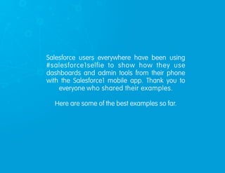This document shares examples of how Salesforce users are using dashboards and admin tools from the Salesforce1 mobile app. It provides screenshots from various users showing how they track goals, monitor sales performance, prioritize IT backlogs, and manage user training from their phone. The examples illustrate how the Salesforce1 mobile app allows users to access critical data and stay on top of their business anytime from any location.