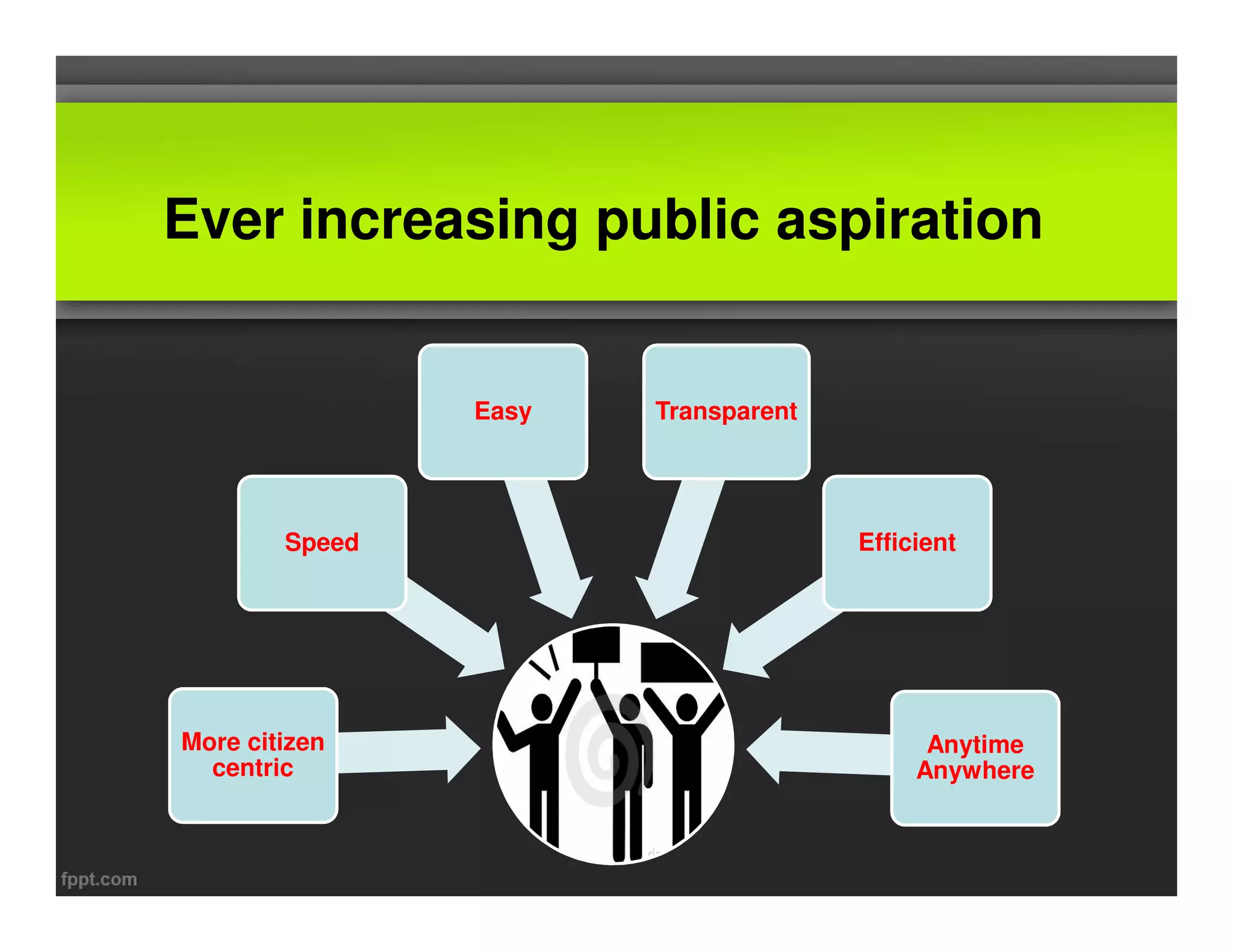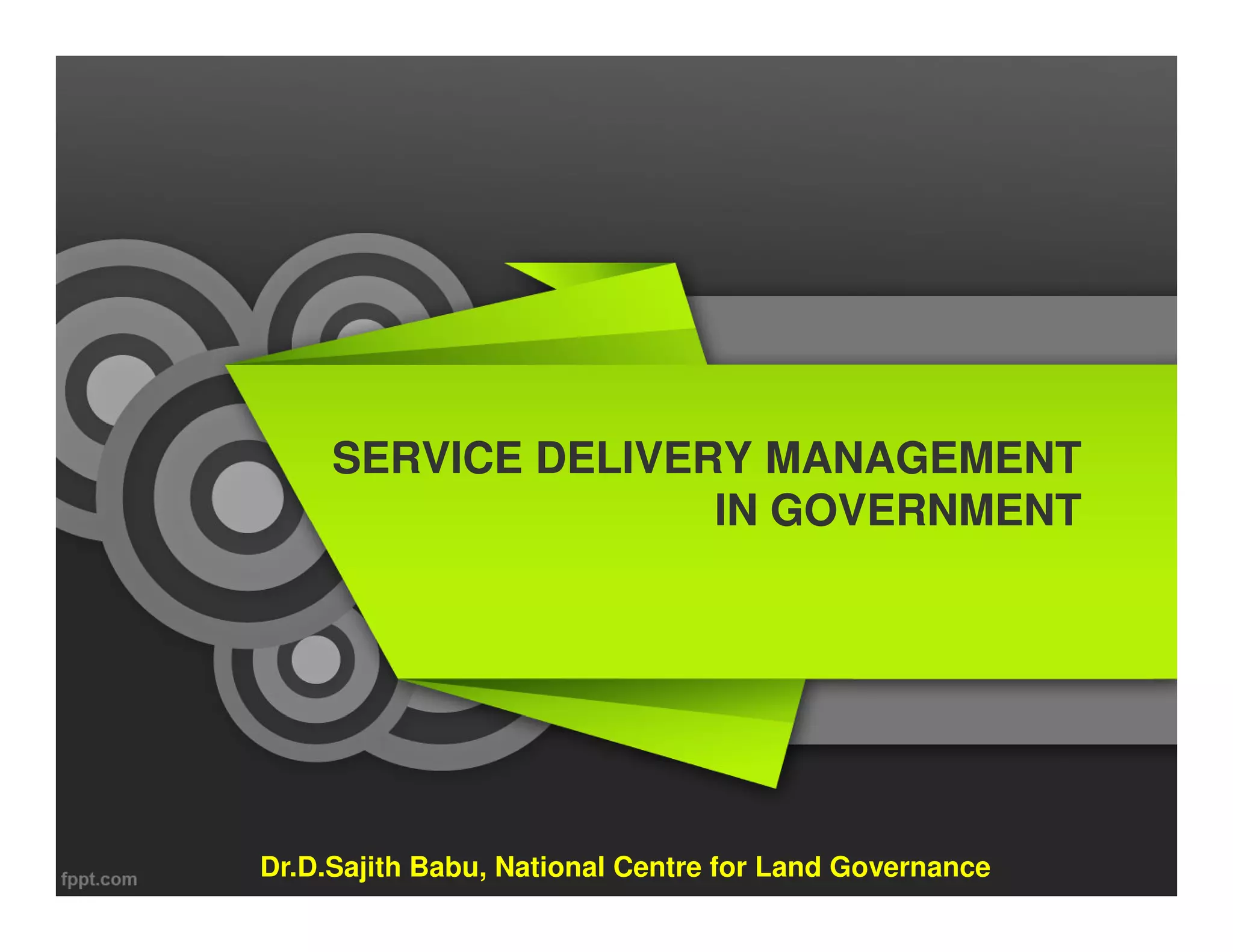 The document discusses service delivery management in government. It notes that public expectations for government services are increasing while delivery has been inefficient due to issues like red tape, corruption, and outdated rules and procedures. The document advocates for re-engineering government processes to make them more citizen-centric, transparent, efficient and delivered anytime, anywhere. It provides examples of projects in the Indian state of Kerala that aim to transform service delivery through e-governance and digitization.