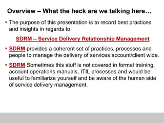 This document outlines best practices and insights in Service Delivery Relationship Management (SDRM), emphasizing the importance of human relations in delivering services effectively. It introduces the '5 C’s' and '3 R’s' as essential components for successful service engagement, focusing on customer-first approaches, collaboration, and proactive issue resolution. Additionally, it highlights the significance of building relationship capital to enhance SDRM equity and ensure long-term client satisfaction.