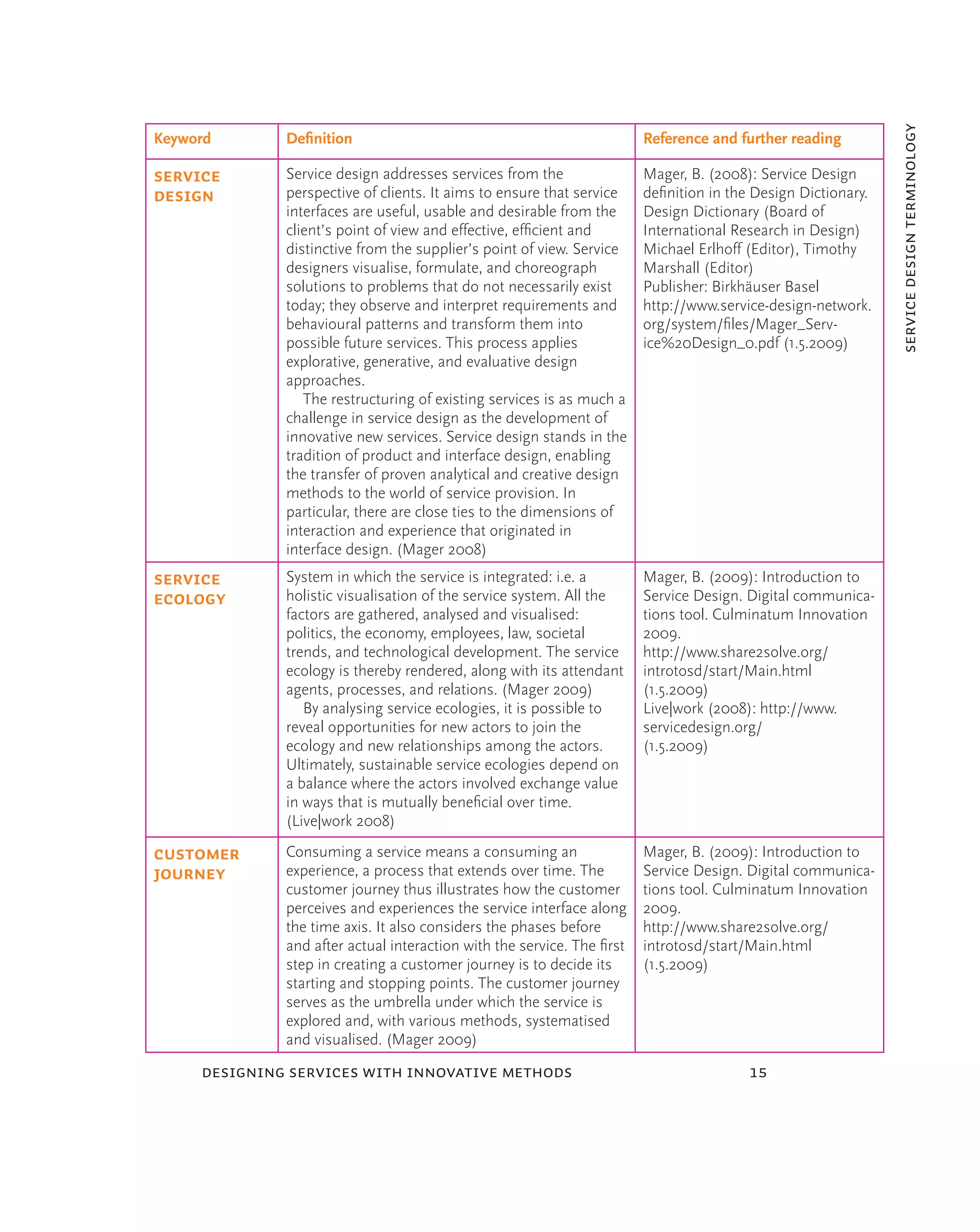 The document defines key terms related to service design terminology. It provides definitions for terms like service design, service ecology, customer journey, service touchpoints, front office/frontstage, back office/backstage, service blueprint, and more. Each term is defined concisely and includes a reference source for further reading on that particular topic. The document serves as a useful reference for the essential terminology used in service design.