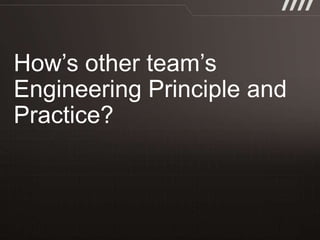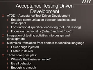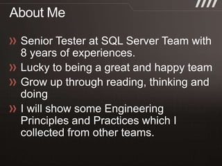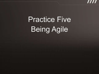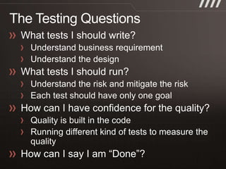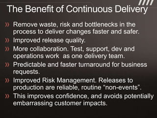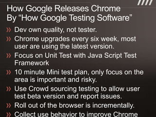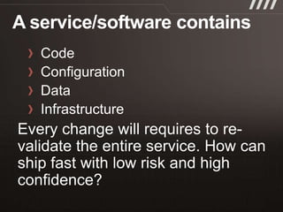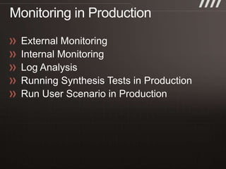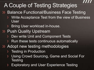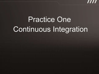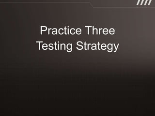 The document discusses key practices for software development, emphasizing continuous integration and continuous delivery to improve service quality and engineering agility. It advocates for a robust testing strategy, including testing in production and frequent automated deployments to enhance software release reliability. The focus is on creating efficient processes to ensure quality, reduce costs, and deliver customer value consistently.