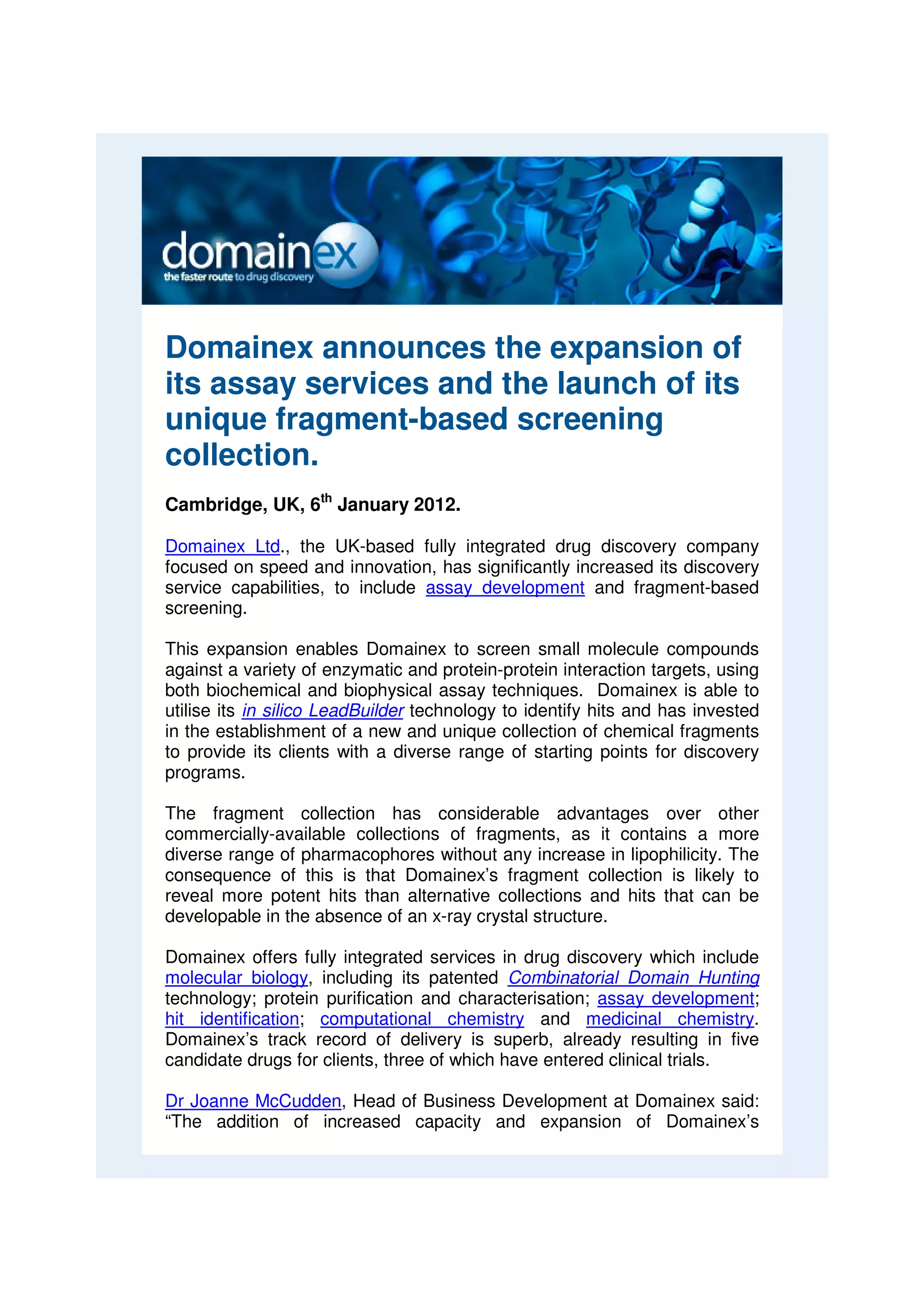 Domainex has expanded its assay services to include assay development and fragment-based screening using both biochemical and biophysical techniques. It has also launched a new collection of chemical fragments that is more diverse than other commercially available collections. This expansion allows Domainex to screen small molecules against various targets and identify hits using its in silico LeadBuilder technology.