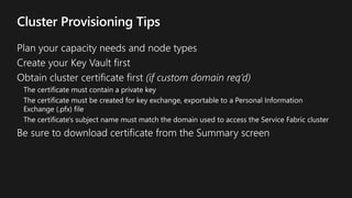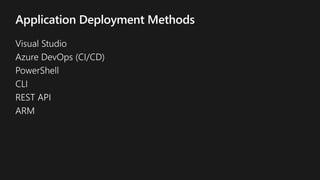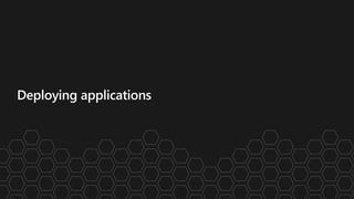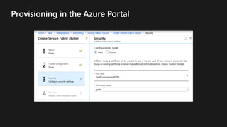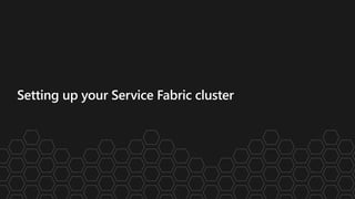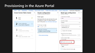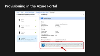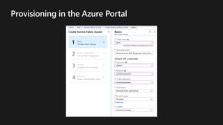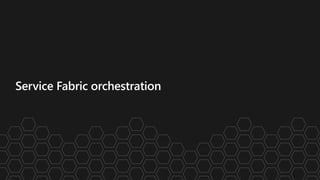 The document compares monolithic and microservices application architectures. A monolithic application contains most functionality within a few processes, while a microservices application separates functionality into independent services. Azure Service Fabric is a platform for building and managing microservices applications, allowing development and management of containers and microservices on any OS at scale on any cloud.