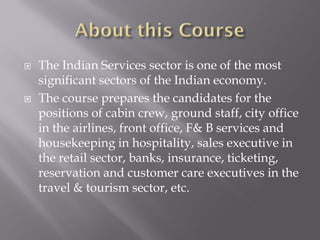 The document outlines a BBA program focusing on service industry management, preparing students for various roles in sectors such as airlines, hospitality, retail, banking, and tourism. It covers a wide range of subjects including service operations, human resources, customer relationship management, and financial management, along with practical training opportunities. The curriculum emphasizes emerging service sectors in South Asia and includes case studies and field visits for experiential learning.