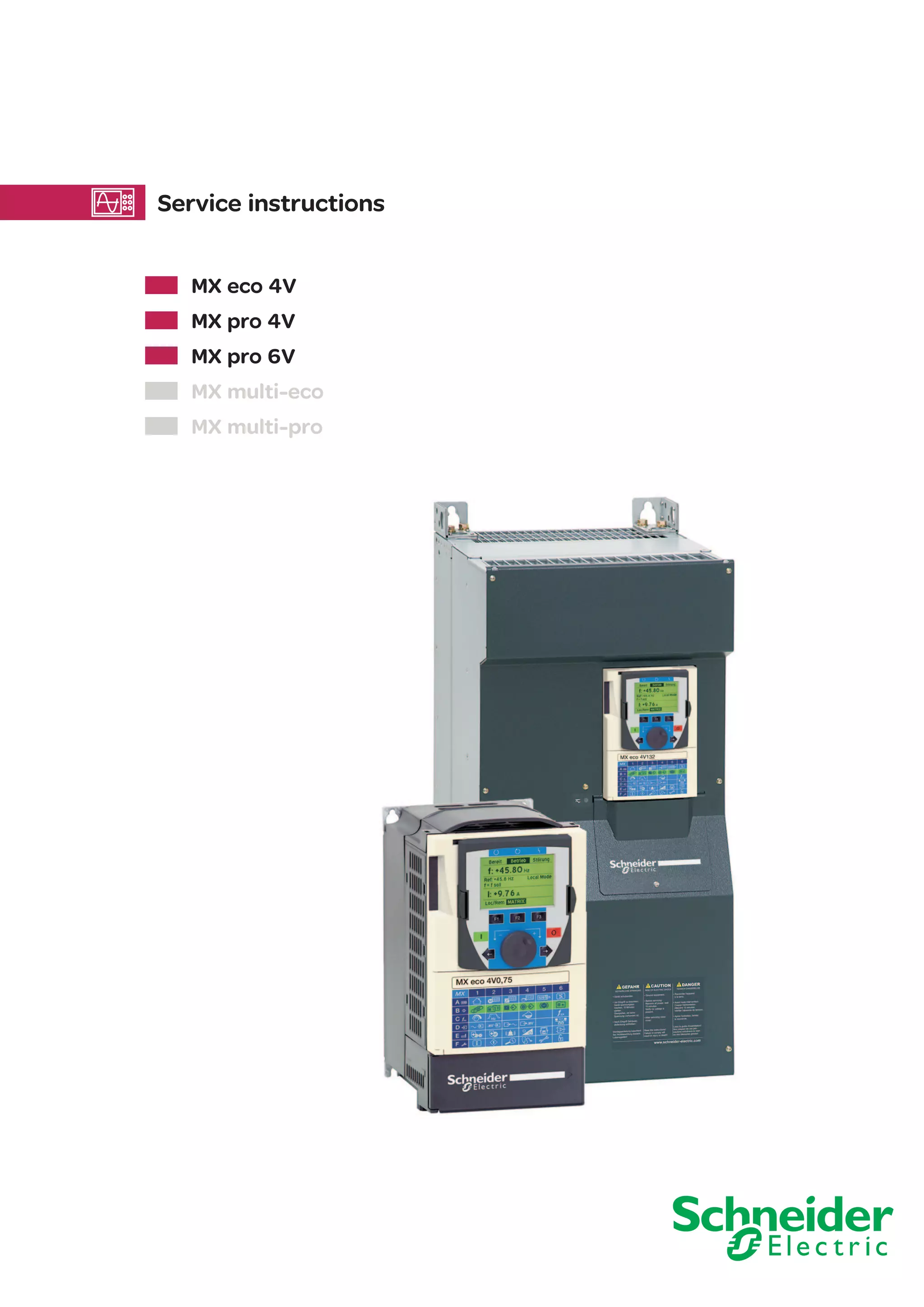 This document provides service instructions for various MX eco and MX pro frequency inverters. It includes sections on maintenance, troubleshooting, diagnostics, and hardware components. General safety remarks are provided at the beginning, noting that only qualified personnel should perform work and proper precautions must be followed when working on live equipment. The document provides guidance on identifying inverters, environmental considerations, factory settings, motor data, maintenance procedures, diagnostic tools, fault messages, and hardware components for troubleshooting.