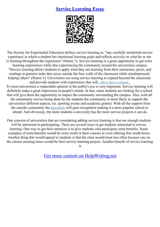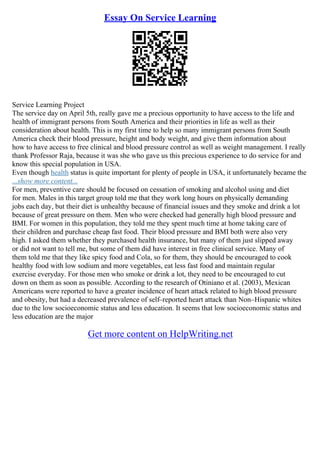 The document discusses the author's experience with a service learning project focused on health awareness among South American immigrants, highlighting their challenges with high blood pressure and unhealthy diets due to financial constraints. It emphasizes the importance of service learning as a method to provide practical community service while enhancing students' social and academic skills. Additionally, the author advocates for mandatory service learning requirements in academic programs to promote character development and community engagement.