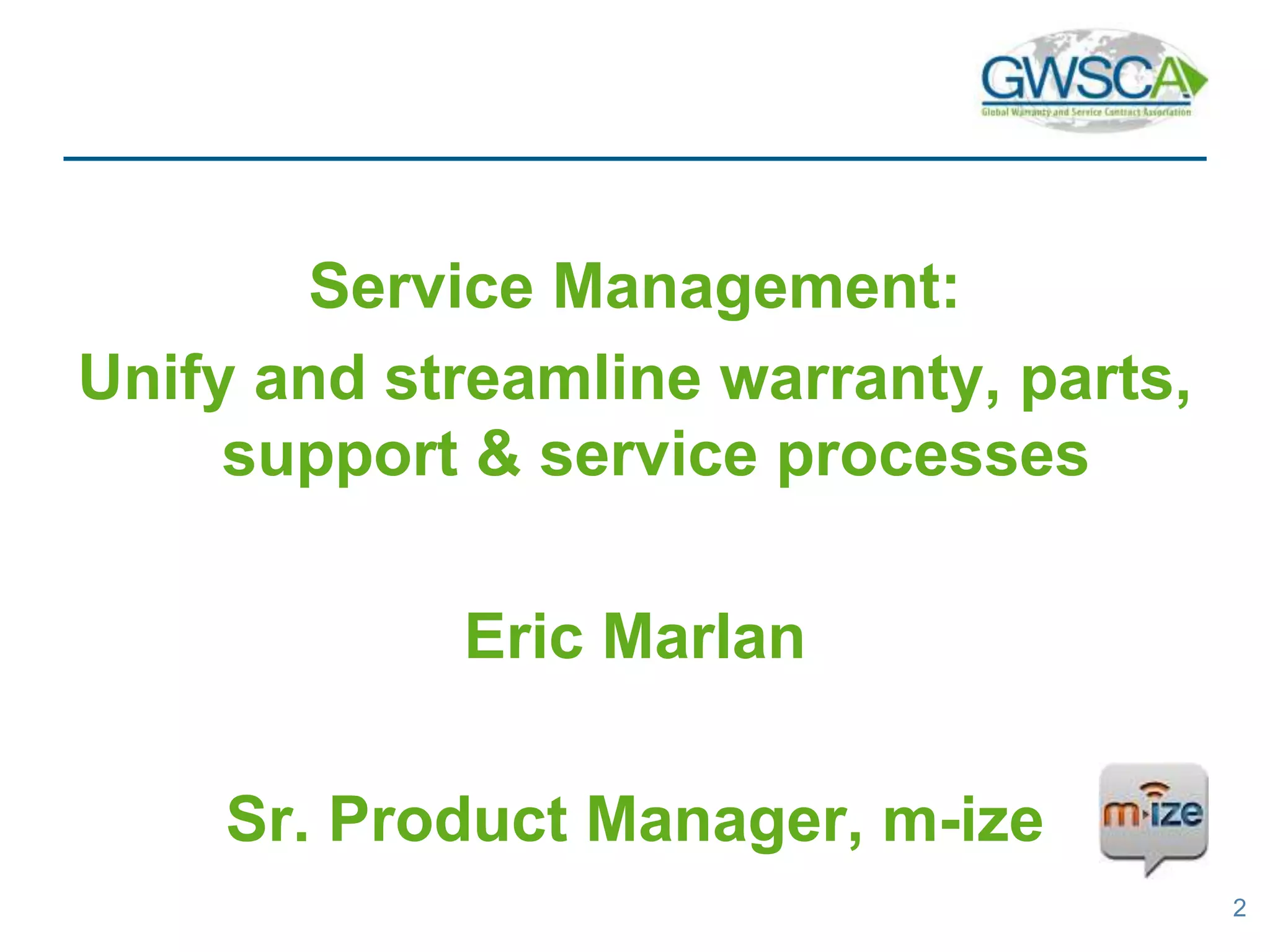The document summarizes a webinar on optimizing service management processes. It discusses challenges like low registration rates and excessive warranty costs. It promotes unifying and streamlining warranty, support, and service processes using integrated systems and mobile/IoT technologies. This allows simplifying experiences, removing barriers, and enhancing value across registration, warranty support, service, and parts management on a global scale.