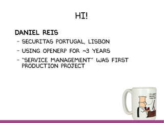 This document summarizes Daniel Reis' presentation on using Odoo/OpenERP for service management at Securitas Portugal. The presentation covered: