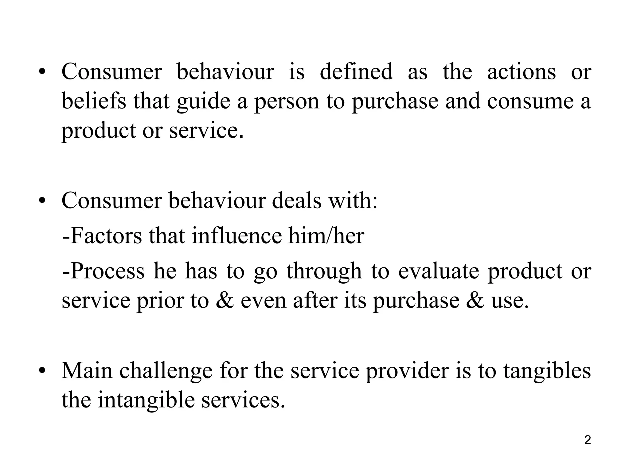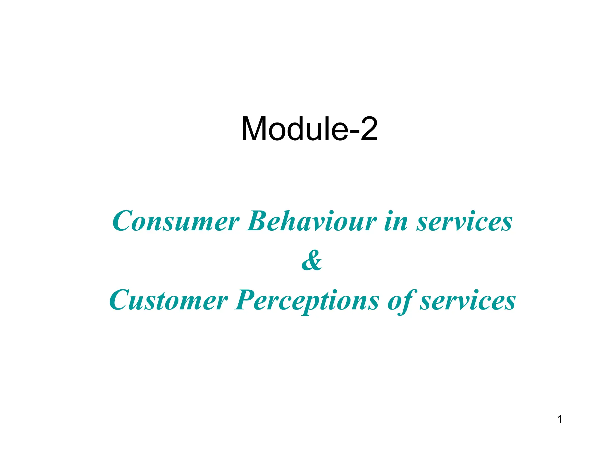 Consumer behavior and customer perceptions of services are influenced by many factors. Consumer behavior examines how external factors like culture, family and marketing activities influence a consumer's decision making process from need recognition through post-purchase evaluation. A customer's expectations are shaped by both explicit and implicit promises made by service providers as well as past experiences and word of mouth. Meeting and exceeding customer expectations is important for positive perceptions of service quality and satisfaction. Managing customer perceptions requires understanding how service encounters, physical evidence, price and image shape a customer's judgment of the overall service experience.