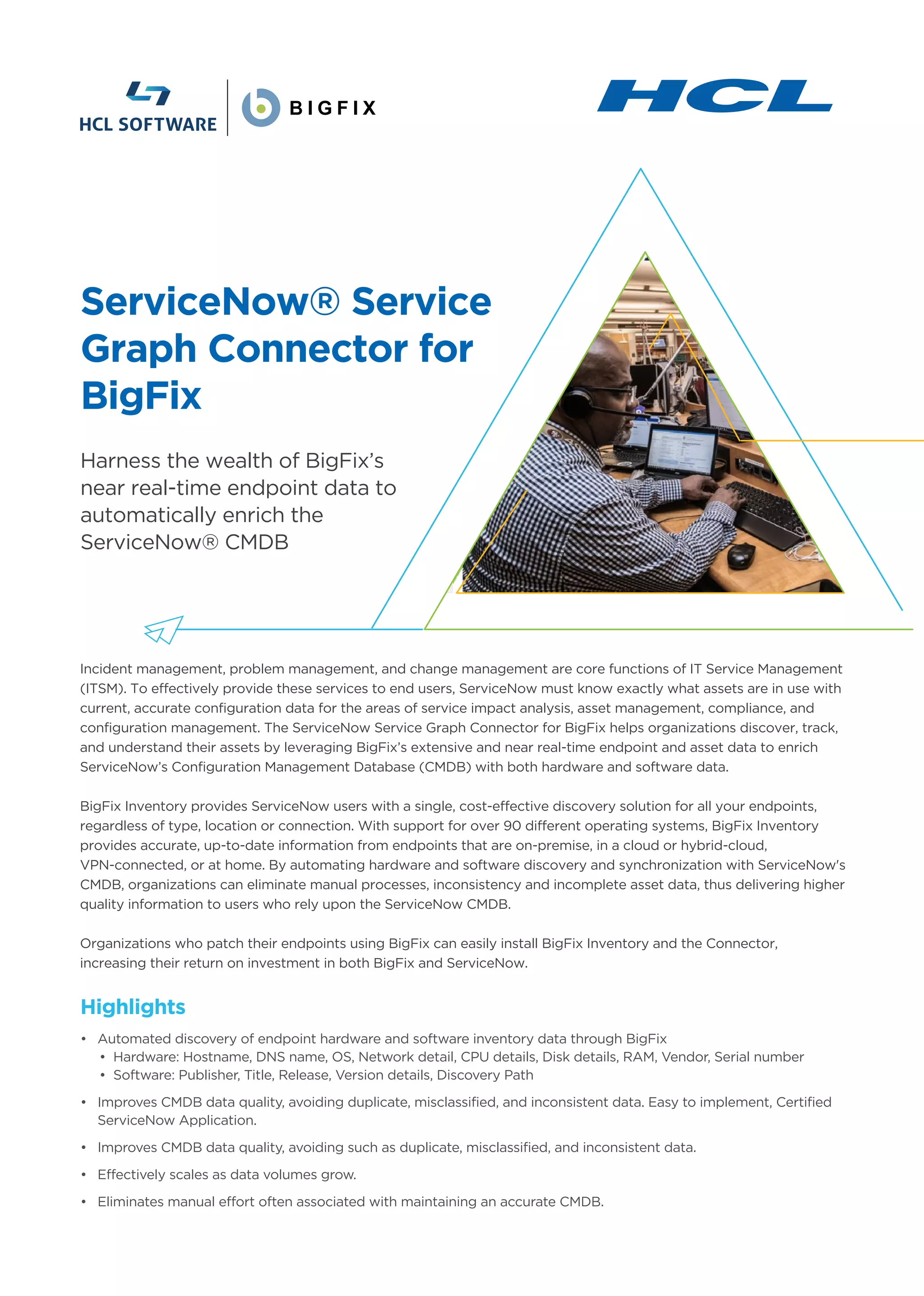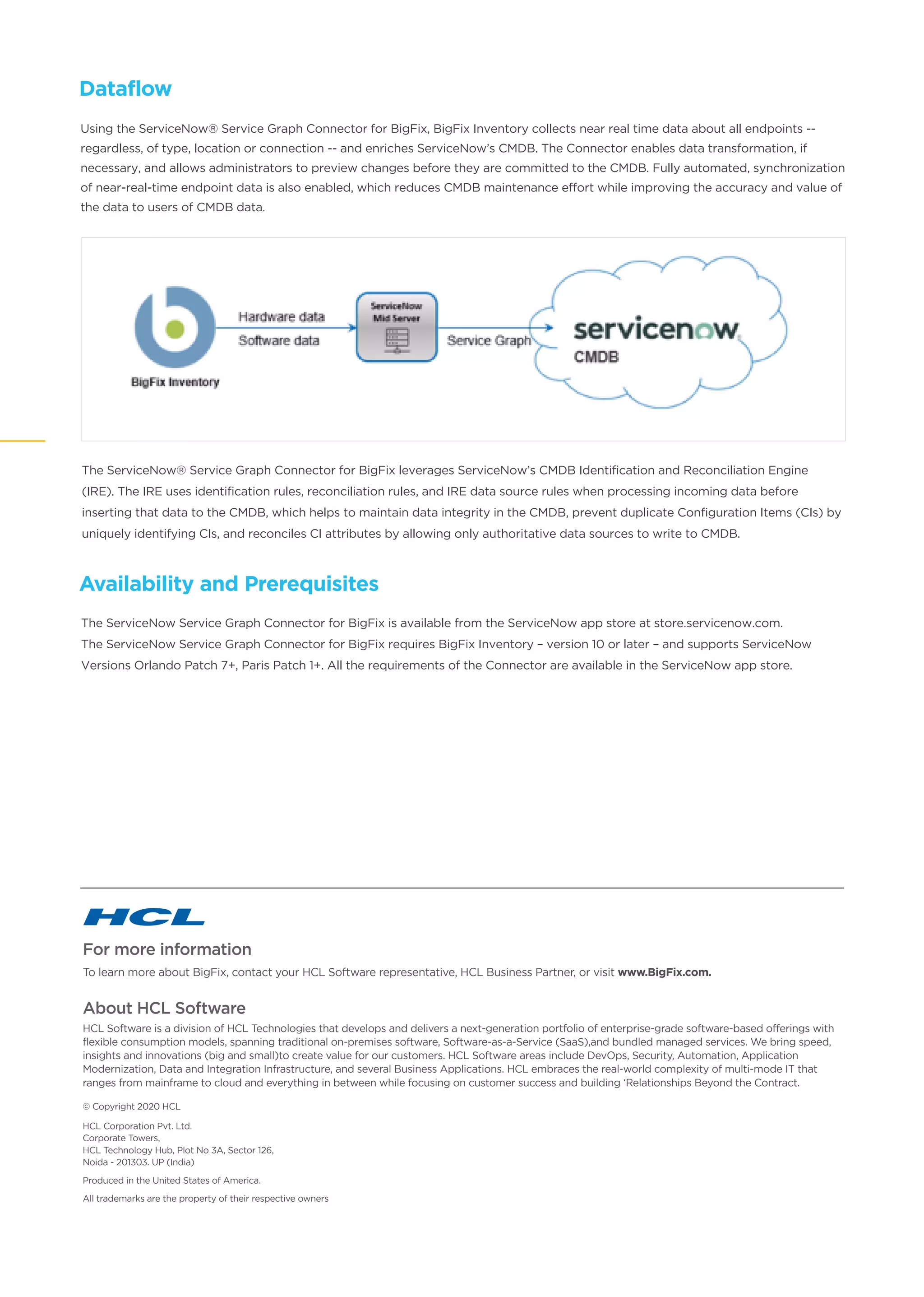 The ServiceNow Service Graph Connector for BigFix automates the discovery and synchronization of endpoint hardware and software data, enriching the ServiceNow CMDB with accurate, near real-time information. This integration improves data quality, reduces manual efforts in maintaining the CMDB, and supports comprehensive IT service management functions. The connector is compatible with BigFix Inventory version 10 or later and provides organizations with a cost-effective solution for managing assets across various environments.