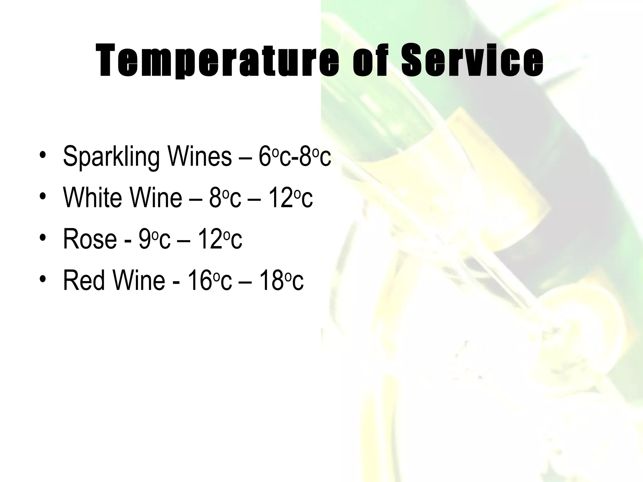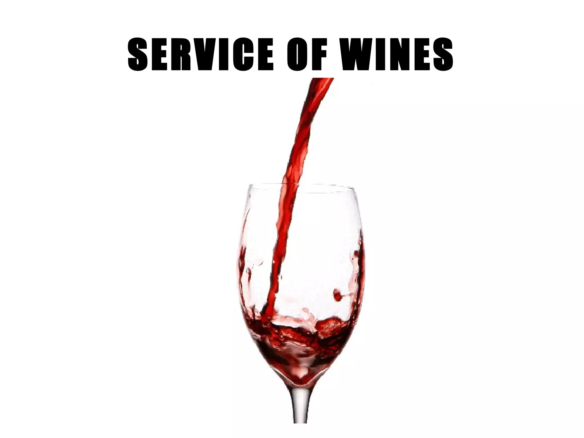 The document provides steps for properly serving wines. It recommends serving sparkling wines between 6-8°C, white wines 8-12°C, rosé wines 9-12°C, and red wines 16-18°C. For both white and red wines, the steps include presenting the bottle to the host, removing the foil, opening with a corkscrew, wiping the neck, removing the cork, pouring a taste for the host's approval, and then pouring clockwise starting with ladies filling glasses to 2/3 for white and 1/2 for red.