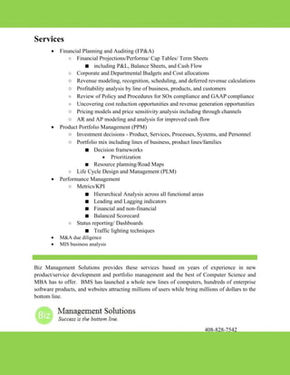 Biz Management Solutions allows decision makers to view information to manage projects, teams, functional areas, business units, or entire enterprises. It provides a unique hierarchical view and encompassing financial planning, strategic planning, and process planning with time-proven methodologies beyond ERP and CRM systems. Biz Management Solution offers services including financial planning and auditing, product portfolio management, performance management, M&A due diligence, and MIS business analysis based on years of experience in new product development and portfolio management.