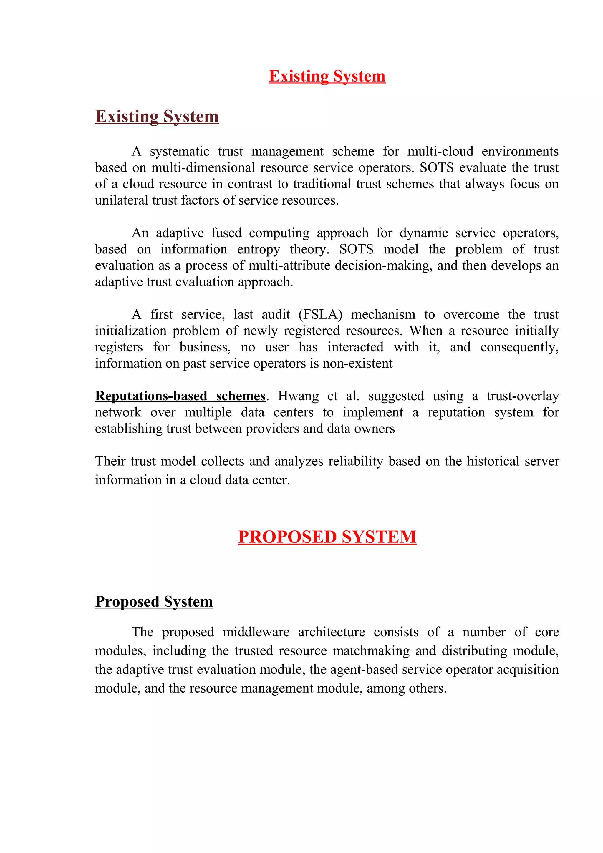 The document proposes a service operator-aware trust scheme (SOTS) for resource matchmaking across multiple clouds. SOTS uses a middleware framework to evaluate trust based on multi-dimensional resource service operators to improve dependability. The broker can efficiently select the most trusted resources in advance using an adaptive trust evaluation approach based on information entropy theory. This overcomes limitations of traditional schemes that manually weight trust factors.