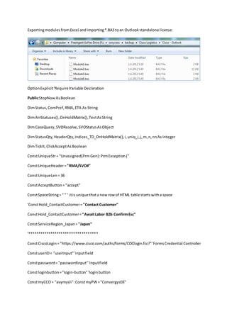 The document is a VBA script that automates the process of exporting data from Excel and interacting with a web interface for Cisco's SVO Resolve tool. It includes detailed subroutines for navigation, login, and data retrieval, specifically focusing on managing status updates and handling customer service responses. The code is structured to ensure it carries out functions efficiently while managing user input and web elements dynamically.